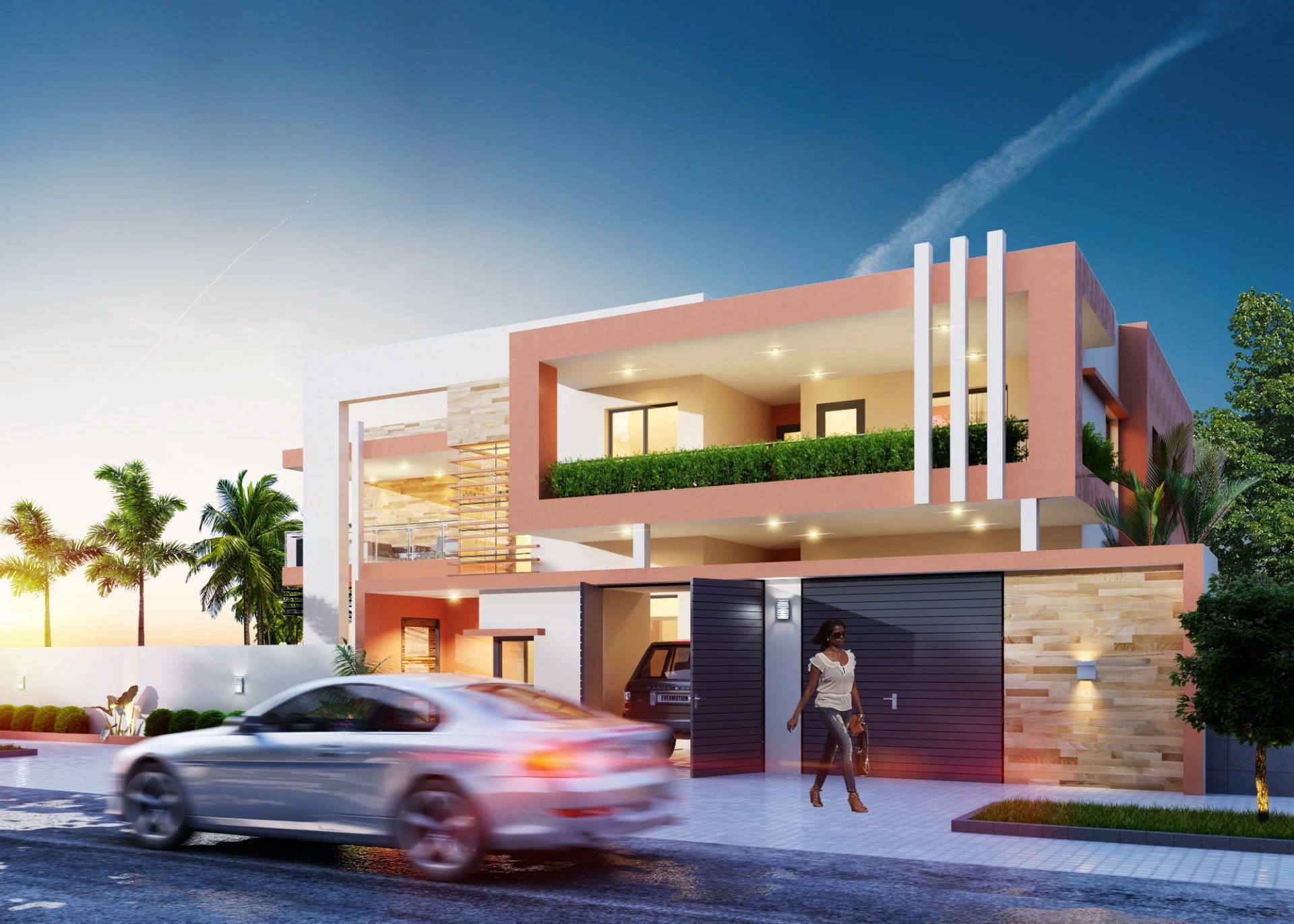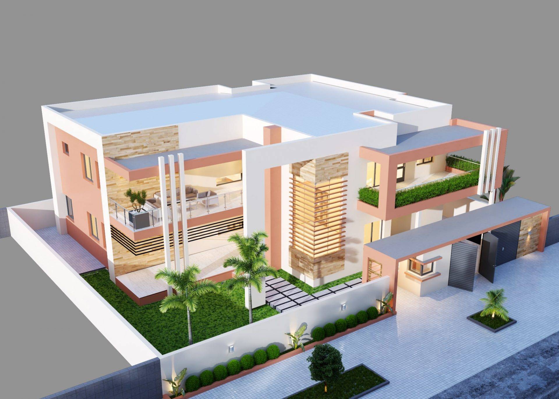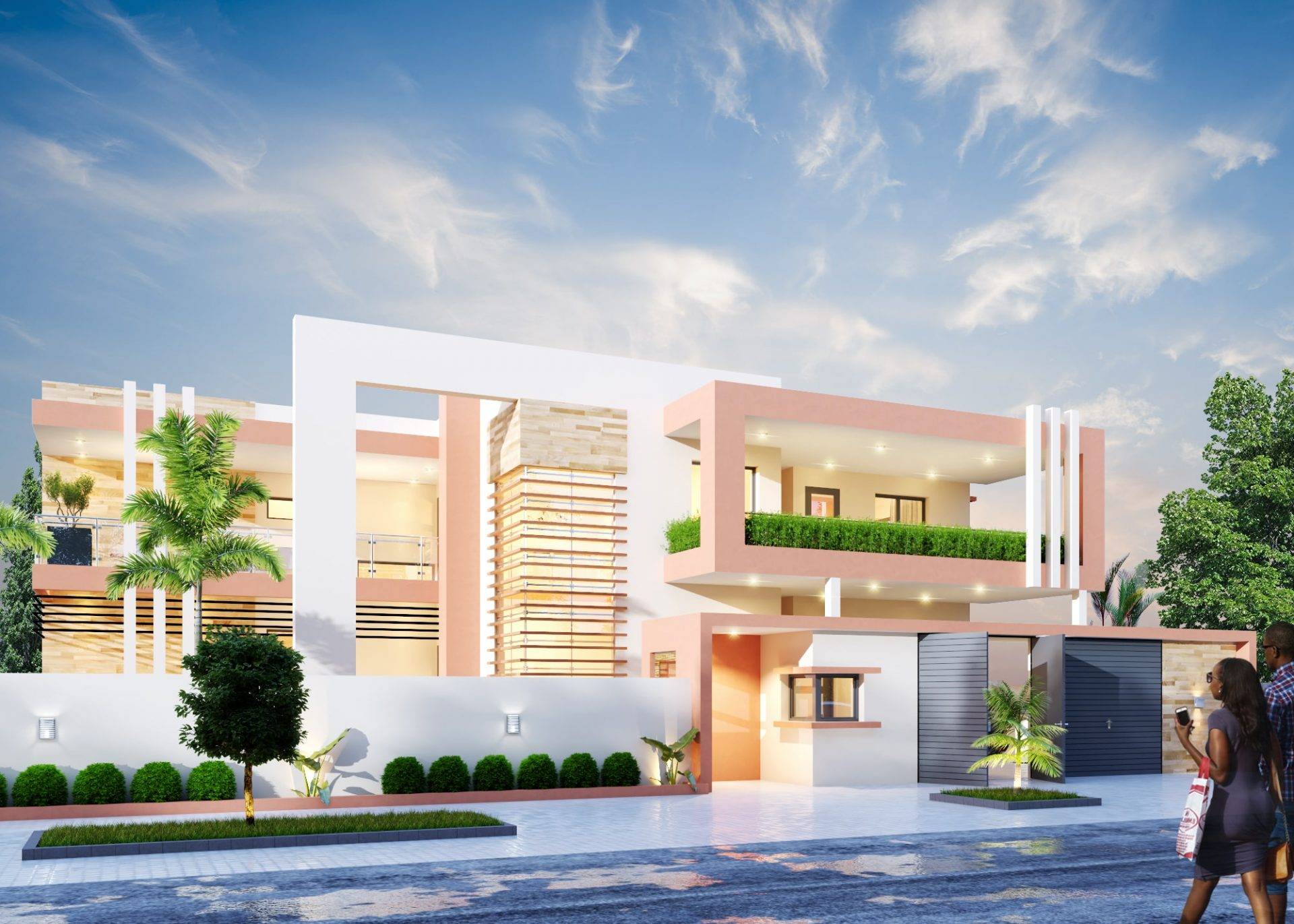Ce projet s’inscrit dans un style contemporain souhaité par le client. Il a une architecture simple et dynamique. Le programme comprend entre autres 2 séjours, une salle à manger, une cuisine, un magasin, un espace enfants, un bureau, 7 chambres, 6 salles de bain, une toilette, 2 dressings, 3 grandes terrasses, un garage 2 véhicules, une guerite, un grand jardin.